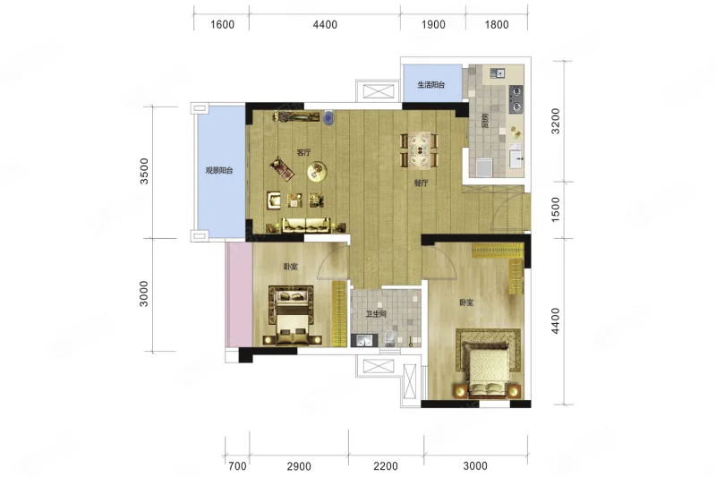 2 室 2 厅 1 卫